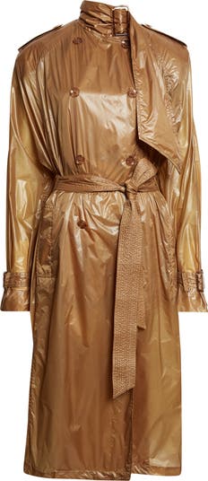 The maison reinterprets the capsule-classic trench coat in an ultraglossy, lacquer-like design that's belted at the waist as well as at the neckline.