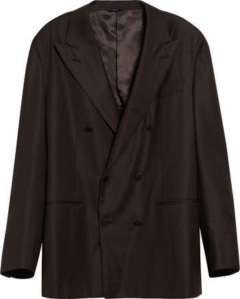 Showcasing impeccable Italian tailoring, this unstructured double-breasted blazer made from rich, soft wool features soft shoulders and wide peaked lapels, creating a distinctive and modern look.
