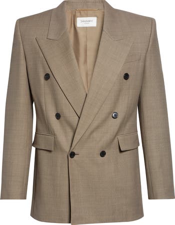 This strong-shoulder double-breasted jacket designed with wide peaked lapels is expertly tailored in Italy from midweight wool suiting and lined in supple silk.