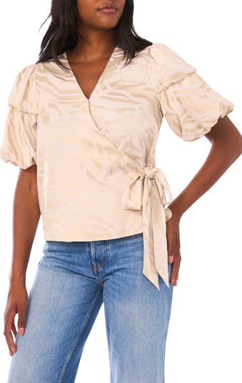 Double Bubble Sleeve Satin Jacquard Wrap Front Top