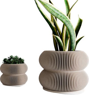 Sizes: Large: Height: 6.3 inches | Width: 8 inches Medium: Height: 4.7 inches | Width: 6 inches Small: Height: 3.17 inches | Width: 4 inches Looking for something custom? Feel free to reach out for personalized sizes or colors. Modernized design We designed the Double BUBBLES planter to bring a sense of playful elegance to your home, combining modern form with soft, flowing curves. Its unique, ribbed structure and stacked design create a bold yet refined look, making it the perfect statement piece to showcase your plants in style. The drip tray/saucer is custom-fitted and designed to perfectly complement the planter. Made from 98% Plant-Based Materials | BioPlastic & Wood Fibers