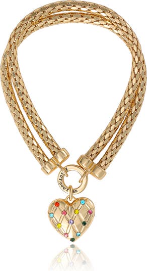 Layered look, zero effort. Two glittering gold-tone chains anchor a statement heart padlock charm kissed with multicolor crystals. It's the perfect pop or a night‑out slip.