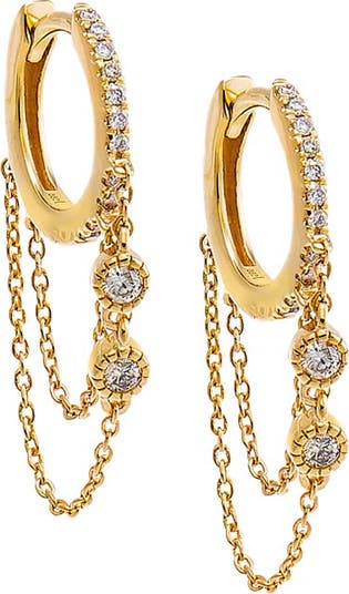 Double Diamond Solitaire Dangling Chain Huggie Earring 14K