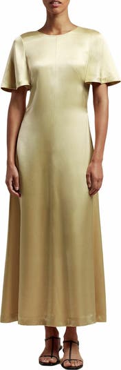 - Double face silk charmeuse brings luxurious texture to this dress with a crewneck in front, a V-back, and short fluttered sleeves with a 1930s bias cut silhouette.