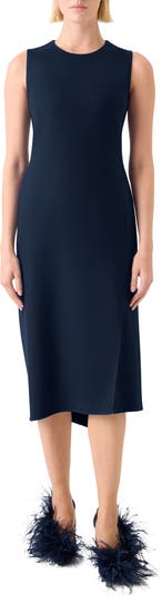 A classic sheath silhouette takes a dramatic turn via a slightly flared asymmetric hem on this midi dress impeccably fashioned from double-face vrigin-wool flannel.