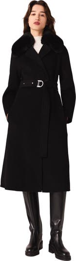 This season, Maje is reinventing seasonal essentials to wrap silhouettes in softness and modernity. A long coat with an architectural silhouette that is both fluid and soft. The double-faced wool gives it a substantial drape, while the removable faux fur collar adds a retro-chic touch. The belt accentuates the waist for a feminine, structured and timeless look.Wear with an ecru round-neck knit sweater and high black riding-style boots.
