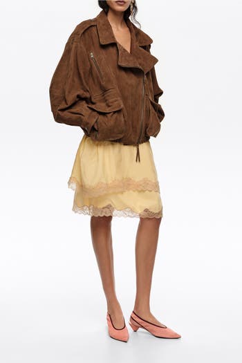 Double-breasted balloon-fit jacket crafted from 100% suede. Designed with a front metal zip, maxi lapel collar, and long sleeves with cuff darts and press-stud fastening for added shape. Finished with bellows pockets and shoulder tabs.