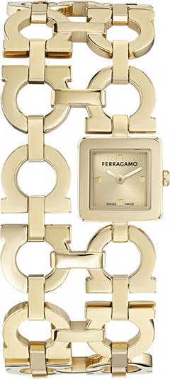 Signature double gancini links are themselves doubled up to make a truly statement bracelet watch—an accessory that keeps you impeccably on trend and on time.