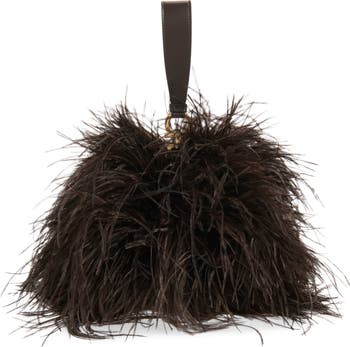 Inspired by a vintage style from the archives, this mini evening bag explodes with glamorous volume in a dramatic plume of ostrich feathers that sway as you move. It features a satin frame with suede details, accented by the golden Gancini buckle that holds the leather handle.