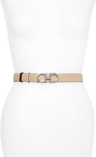 Signature double-Gancio hardware with a gleaming silvertone finish refines a slim belt fashioned from richly textured calfskin.