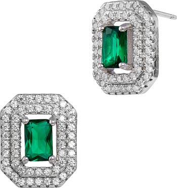 Concentric rings of sparkling cubic zirconia frame the lab-created emeralds of these elegant stud earrings.