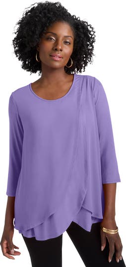 A crossover panel with contrast Georgette layer adds textural appeal and a breezy element to the Jessica London women's plus size high-low Double Layer Tunic. Pair it with skinny jeans for a play on proportion.