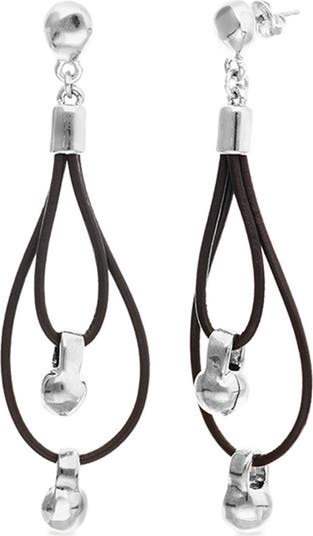 Long double leather earrings with sterling silver-plated dial detail. Lines that fall softly, ending in a silvery dial that attracts all eyes. Elegance in motion.