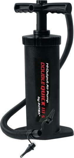 Great for airbeds or other large inflatables, the simple to use Double Quick III S Hand Pump is the perfect accessory for inflating and deflating with ease. Designed to pump air on both up and down strokes, this double action pump maximizes airflow. Inflating is fast and simple with 3 interconnecting nozzles with hoses to inflate or deflate different types of inflatables. Recommended for ages 18 and up. WARNING: CHOKING HAZARD -- Small parts. Not for children under 3 yrs.
