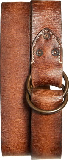 Bring a vintage-inspired element to your casual looks with this leather belt with a weathered look that's enhanced by an antique-finish O-ring buckle.