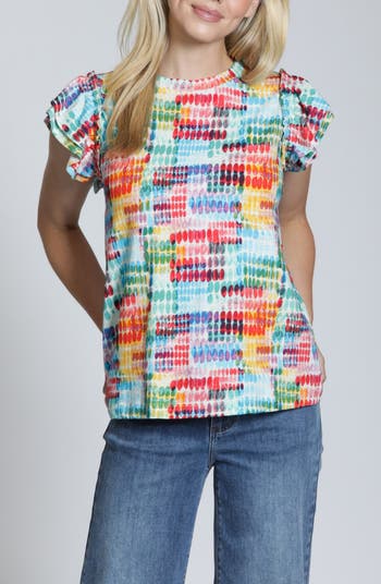 Bring vibrant energy to your off-duty look with the bubbly pattern and rainbow colors of this cotton top that's sweetly framed with ruffled cap sleeves.