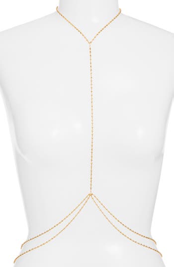 An extralong length lets you play with the design of this drapey satellite body chain plated in gleaming 18-karat gold.