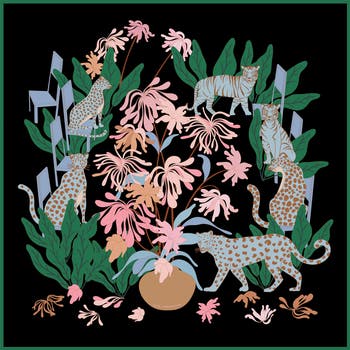 "Night Jungle Gathering" is a celebration of mystery and vitality, where leopards and tigers roam among leaves and blooming floral under a nocturnal sky. The composition captures both strength and elegance, with intricate details that bring the jungle to life. Featuring the same rich color palette on both sides, it offers a harmonious look from every angle. Crafted with exceptional attention to detail, the scarf also boasts hand-rolled edges that add a luxurious finish.