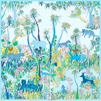 "Animal Kingdom" is the result of five months of hand-drawing, carefully scanned and refined digitally. Every detail reflects our meticulous craftsmanship. The design features various animals walking through a tropical rainforest. Meticulously crafted with exceptional attention to detail, this exquisite accessory also boasts hand-rolled edges that add a luxurious finish.