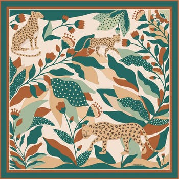 "Green Wonderland" draws its inspiration from the enchanting tales of 'The Wizard of Oz' and 'Jungle Adventure', merging the mystical elements of a tropical rainforest's fauna and flora. This versatile accessory exhibits the same colors on each side, contributing to its unique charm. Meticulously crafted, the scarf features hand-rolled edges and is embellished with detailed illustrations of garden produce, lending it a luxurious and distinctively elegant appearance.