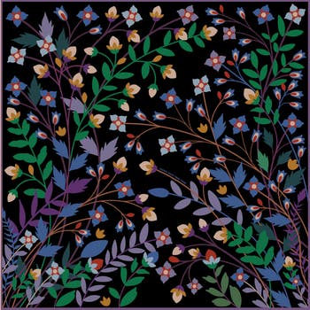 "Night Garden" is inspired by the beauty of a garden at night, with flowers blooming in peaceful serenity. The colors on each side of the scarf are different, enhancing its visual appeal. Crafted with exceptional attention to detail, it features hand-rolled edges that add a luxurious finish to this exquisite accessory.