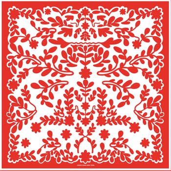 "Red Blessing" is a vibrant celebration of joy and tradition, featuring bold floral motifs inspired by the elegance of folk-art cutouts. The design combines strength and delicacy, with ornamental patterns that radiate festive energy and timeless charm. Featuring the same rich color palette on both sides, it offers a harmonious look from every angle. Crafted with exceptional attention to detail, the scarf also boasts hand-rolled edges that add a luxurious finish.