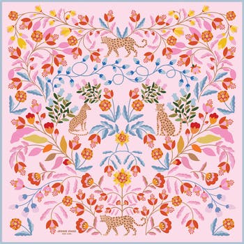 "Pink Blossom Jungle" is inspired by the scenes within a tropical rainforest. This versatile accessory features different colors on each side. Finished with hand-rolled edges and embellished with detailed illustrations of garden produce, providing it with a luxurious and uniquely elegant appearance. This silk-wool blend scarf combines the softness of silk with the warmth of wool. Lightweight yet cozy. A versatile accessory to elevate any outfit.