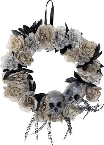 Embrace the menacing mood of the holiday season with this fashionably forbidding Halloween wreath by Northlight. The 16-inch double skull wreath features artificial roses in two shades of gray, accented with black foliage. Decor is mounted on a wrapped foam backing, with a black satin ribbon ready for hanging. Product Features: Unlit Comes ready to hang from a black ribbon Fabric wrapped foam backing No assembly required - wreath comes in 1 piece Recommended for indoor use - if using outdoors place under a covered area Dimensions: 16" diameter (measured from outermost edge to outermost edge across the wreath) Inner diameter: 8.5" Material(s): plastic/foam