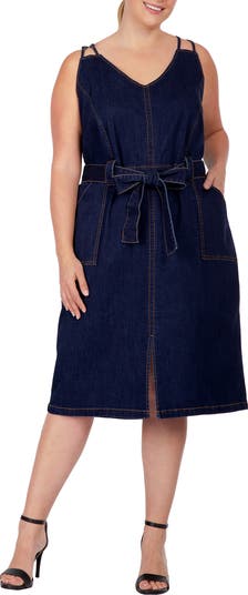 A defining tie tethers the waist of this denim dress styled with double straps and a front slit.