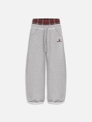 These pants feature a distinctive double waistband design paired with plaid patchwork, creating a bold retro-inspired look. The elongated cut enhances the proportions of the legs, while the relaxed fit ensures comfort and ease of movement. With their unique detailing and versatile silhouette, these pants bring a playful yet stylish edge to everyday streetwear.