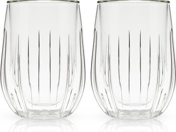 Take time to savor your wine. The double-walled design of these stemless glasses maintains your wine’s temperature and prevents condensation for a smooth sipping experience. Made from borosilicate glass with a cut-glass design.