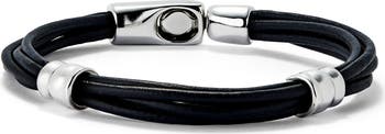 Two rounded leather cords are linked by sterling silver-plated tubes for a stacked bracelet shape.