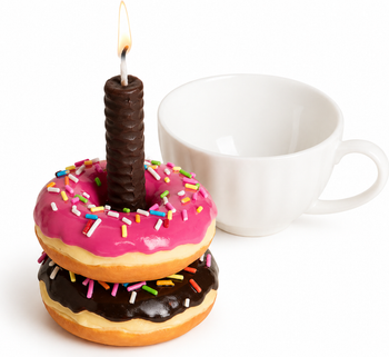 A doughnut candle set designed to look like a realistic dessert, featuring two doughnut wax pieces and a chocolate stick wick arranged in a teacup for playful home décor, gifting and novelty display. Hand-poured in soy-blend wax, this food-inspired candle recreates the look of frosted doughnuts with colorful sprinkles and detailed texture. Finished with a chocolate scent, it adds a fun, decorative touch to desks, shelves or kitchen spaces.