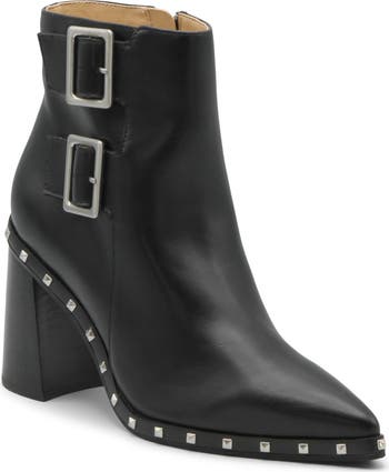 Brushed buckles and pyramid midsole studs create an edgy aesthetic on a slip-resistant bootie balanced by a pointy toe and stacked block heel.