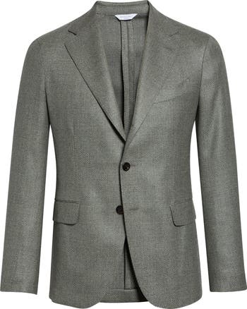 Basket weave–patterned virgin wool relaxes the formality of a blazer designed in a neutral sage green hue. An unlined interior makes it an easy-wearing, breathable complement to any semiformal or elevated-casual look.