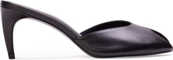 Almond peep toe mule, set on a c-curve mid heel.