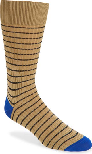 Rings of neat stripes pattern a pair of dress socks knit with breathable cotton and designed to reach to the calf for fuller coverage when you sit.