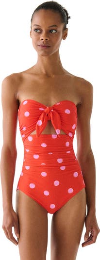 A retro inspired one piece swimsuit is form fitting and skims the body but is comfortable enough to wear all day. A colorful polka dot print is playful. Wear it strapless for minimal tan lines or add the strap for support.
