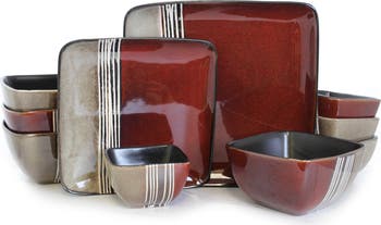 Elama presents the Downtown Loft 16 piece Modern Premium Stoneware set with a Double Bowl table setting for 4. This dinnerware set is ready to make a statement at your next dinner party. With a sophisticated and bold color block design this set is pure style and individuality. Downtown Loft's tones are chosen to highlight your meal and accentuate the naturally scrumptious hues of the foods this plate so elegantly displays. This high quality stoneware set feature large dinner plates measuring diagonally at 13.25". No matter the appetite of your guests this plate will be up to the challenge. The Desert Plate is not far behind with a an impressive diagonal measurement of 11.5" for any guest with an extra large sweet tooth! And in addition, there is a perfectly portioned Desert Bowl measuring at 5.5" Diagonally. This unique combination is the perfect place setting to accommodate meals with more courses, or extra condiments and tasting options for the table to share. Dinnerware Includes:Four Large Dinner Plates 10.25 x 10.25", Diagonally 13.25"Four Large Salad Plates 8.25 x 8.5", Diagonally 11.5"Four Large Bowls 6 x 5.75 x 3.25", Diagonally 7.25"Four Desert Bowls 4.5 x 4.25 x 2.25", Diagonally 5.5" Dinnerware is Crafted of High Quality Stoneware. Dishwasher and Microwave Safe for your convenience.