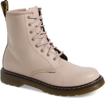 Your little trendsetter is ready to romp through playgrounds in the premium durability and flexibility of this smooth leather combat boot boasting the brand's iconic yellow topstitching.