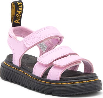 The signature pull-loop and chunky sole with bright yellow stitches give grunge cred to this strappy kid-sized sandal finished with a cushy, contoured footbed.