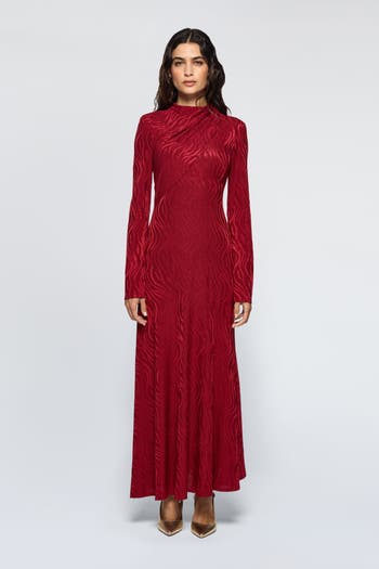 The Draco Dress is a graceful maxi design featuring long sleeves and a unique jacquard print , . Its elegant silhouette and refined touches make it a perfect choice for special occasions or adding sophistication to your everyday wardrobe.
