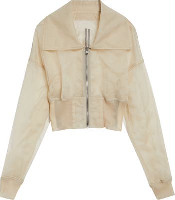 Rick Owens's signature Dracucollar can be adjusted up or down to dramatic effect on this airy tulle bomber jacket lined with silk organza. Deeply dropped shoulders bring a rounded effect heightened by the high nipped-in ribbed waist.