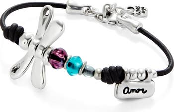 Sterling silver-plated bracelet featuring a dragonfly charm and crystal detail over leather.
