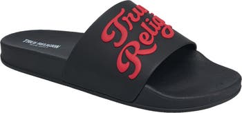 True Religion Men's Drake pool slide featuring a bold script logo across the strap and a molded footbed for cushioned comfort and effortless slip-on wear.