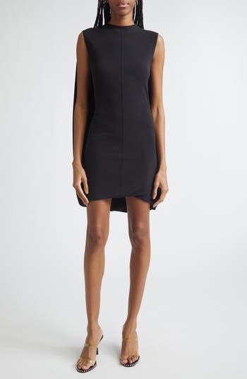 This sleek minidress is designed with a voluminous draped back detail—clean lines in front, fluid movement in back—creating a boldly modern look.