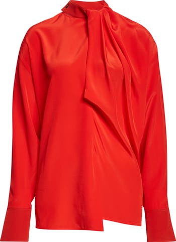 Fiery reds are trending this season and this vibrantly hued shirt with a gracefully draped scarf detail offers a sophisticated way to incorporate the color into your wardrobe.