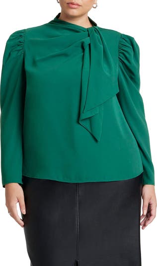 A drapey tie at the neckline complements the puffed shoulders of this stretch-kissed crepe top that adds a touch of glamour to your look.