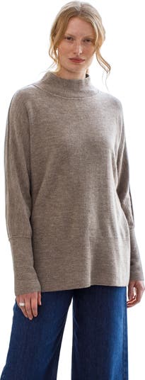 This oversized funnel neck sweater offers a luxurious drape and soft feel. Its fine gauge knit ensures comfort while providing warmth, making it an ideal choice for cooler days.