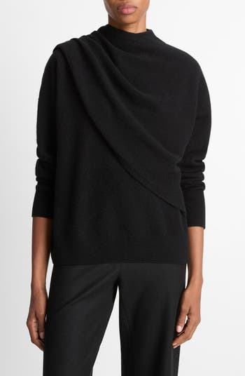 A cozy neckline drape creates dimension on this polished sweater elevated in a woolly cashmere-kissed blend.